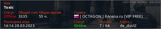 Играет на Counter Strike Source сервере. Страна: РоссияПервый раз замечен 21:25 05.04.2020