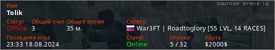 Играет на Counter Strike 1.6 сервере. Страна: РоссияПервый раз замечен 15:48 12.05.2021