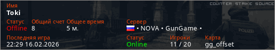 Играет на Counter Strike Source сервере. Страна: РоссияПервый раз замечен 22:25 16.02.2026