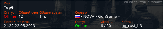 Играет на Counter Strike Source сервере. Страна: РоссияПервый раз замечен 20:25 09.04.2023