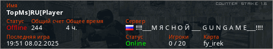 Играет на Counter Strike 1.6 сервере. Страна: РоссияПервый раз замечен 21:12 18.01.2022