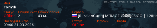 Играет на Counter Strike Global Offensive сервере. Страна: РоссияПервый раз замечен 22:22 28.02.2026