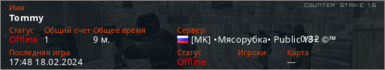 Играет на Counter Strike 1.6 сервере. Страна: РоссияПервый раз замечен 21:45 13.02.2024