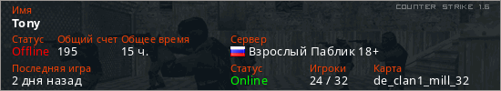 Играет на Counter Strike 1.6 сервере. Страна: РоссияПервый раз замечен 12:28 21.02.2020