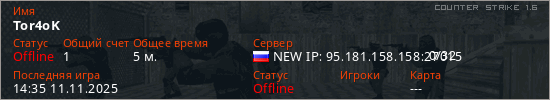 Играет на Counter Strike 1.6 сервере. Страна: РоссияПервый раз замечен 14:02 11.11.2025