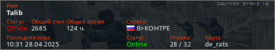 Играет на Counter Strike 1.6 сервере. Страна: РоссияПервый раз замечен 02:46 11.12.2019