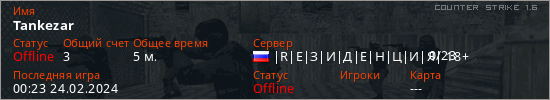 Играет на Counter Strike 1.6 сервере. Страна: РоссияПервый раз замечен 00:21 24.02.2024