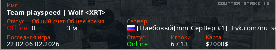 Играет на Counter Strike 1.6 сервере. Страна: РоссияПервый раз замечен 22:02 06.02.2026