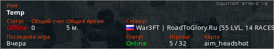 Играет на Counter Strike 1.6 сервере. Страна: РоссияПервый раз замечен 21:34 09.04.2026
