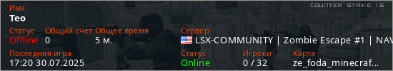 Играет на Counter Strike 1.6 сервере. Страна: СШАПервый раз замечен 17:16 30.07.2025