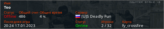 Играет на Counter Strike 1.6 сервере. Страна: РоссияПервый раз замечен 12:12 06.01.2023