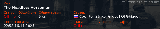 Играет на Counter Strike Source сервере. Страна: РоссияПервый раз замечен 16:29 16.11.2025