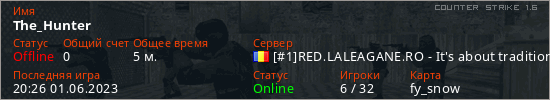 Играет на Counter Strike 1.6 сервере. Страна: РумынияПервый раз замечен 20:24 01.06.2023