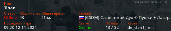 Играет на Counter Strike 1.6 сервере. Страна: РоссияПервый раз замечен 14:27 12.08.2024