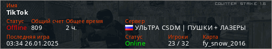 Играет на Counter Strike 1.6 сервере. Страна: РоссияПервый раз замечен 11:25 22.01.2025