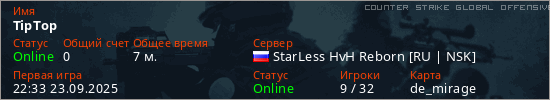 Играет на Counter Strike Global Offensive сервере. Страна: РоссияПервый раз замечен 22:33 23.09.2025