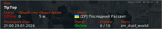 Играет на Counter Strike 1.6 сервере. Страна: УкраинаПервый раз замечен 20:51 29.01.2026