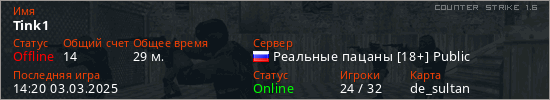 Играет на Counter Strike 1.6 сервере. Страна: РоссияПервый раз замечен 22:25 16.04.2024