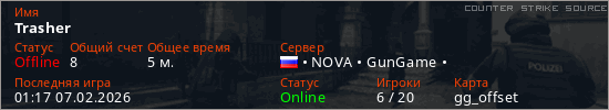 Играет на Counter Strike Source сервере. Страна: РоссияПервый раз замечен 00:39 07.02.2026