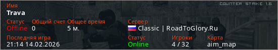 Играет на Counter Strike 1.6 сервере. Страна: РоссияПервый раз замечен 20:53 14.02.2026