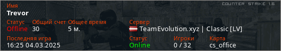 Играет на Counter Strike 1.6 сервере. Страна: ЛатвияПервый раз замечен 16:23 04.03.2025