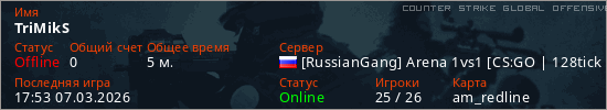 Играет на Counter Strike Global Offensive сервере. Страна: РоссияПервый раз замечен 17:39 07.03.2026