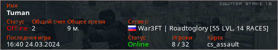 Играет на Counter Strike 1.6 сервере. Страна: РоссияПервый раз замечен 15:28 10.11.2023