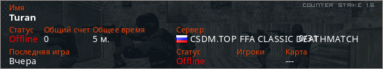 Играет на Counter Strike 1.6 сервере. Страна: РоссияПервый раз замечен 21:05 28.04.2026