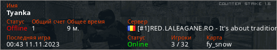 Играет на Counter Strike 1.6 сервере. Страна: РумынияПервый раз замечен 00:06 11.11.2023