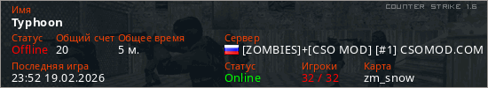 Играет на Counter Strike 1.6 сервере. Страна: РоссияПервый раз замечен 23:47 19.02.2026