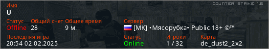 Играет на Counter Strike 1.6 сервере. Страна: РоссияПервый раз замечен 09:43 19.02.2024