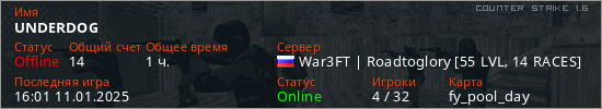Играет на Counter Strike 1.6 сервере. Страна: РоссияПервый раз замечен 17:29 09.12.2024