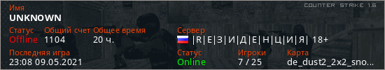 Последний раз был в сети 23:08 09.05.2021 Игрок с таким ником замечен на 30 серверах
