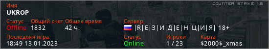 Играет на Counter Strike 1.6 сервере. Страна: РоссияПервый раз замечен 19:50 17.12.2022
