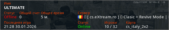 Играет на Counter Strike 1.6 сервере. Страна: РумынияПервый раз замечен 21:26 30.01.2026