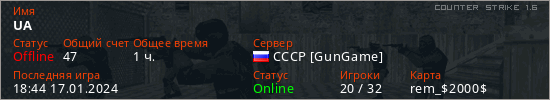 Играет на Counter Strike 1.6 сервере. Страна: РоссияПервый раз замечен 21:51 21.11.2023