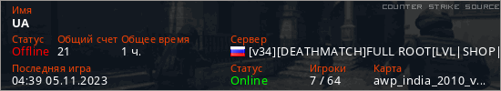 Играет на Counter Strike Source сервере. Страна: РоссияПервый раз замечен 10:42 03.08.2023