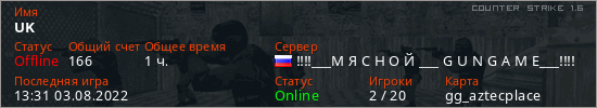 Играет на Counter Strike 1.6 сервере. Страна: РоссияПервый раз замечен 13:37 02.08.2022
