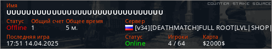 Играет на Counter Strike Source сервере. Страна: РоссияПервый раз замечен 17:49 14.04.2025