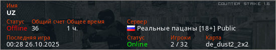 Играет на Counter Strike 1.6 сервере. Страна: РоссияПервый раз замечен 21:52 03.02.2023