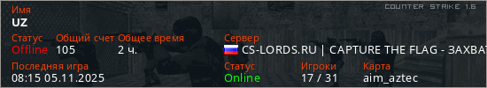 Последний раз был в сети 08:15 05.11.2025 Игрок с таким ником замечен на 22 серверах