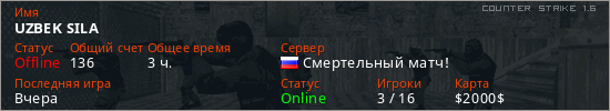 Играет на Counter Strike 1.6 сервере. Страна: РоссияПервый раз замечен 21:57 11.02.2023