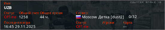 Играет на Counter Strike 1.6 сервере. Страна: РоссияПервый раз замечен 21:43 18.09.2021