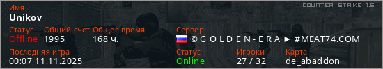 Играет на Counter Strike 1.6 сервере. Страна: РоссияПервый раз замечен 11:01 14.01.2023