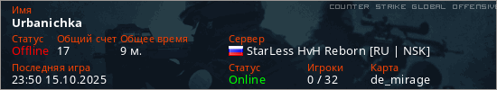 Играет на Counter Strike Global Offensive сервере. Страна: РоссияПервый раз замечен 23:34 15.10.2025