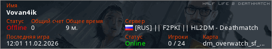 Играет на Half Life 2 DeathMatch сервере. Страна: РоссияПервый раз замечен 11:02 11.02.2026