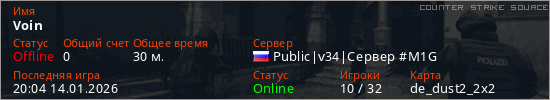 Играет на Counter Strike Source сервере. Страна: РоссияПервый раз замечен 20:00 10.01.2026