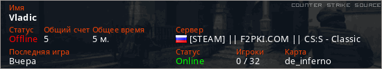 Играет на Counter Strike Source сервере. Страна: РоссияПервый раз замечен 09:15 20.04.2026