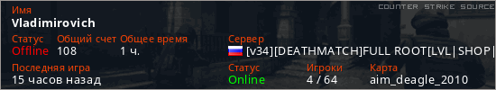 Играет на Counter Strike Source сервере. Страна: РоссияПервый раз замечен 19:45 18.01.2024