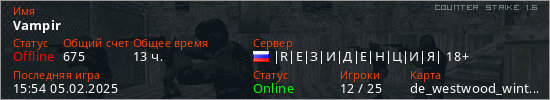 Последний раз был в сети 15:54 05.02.2025 Игрок с таким ником замечен на 28 серверах